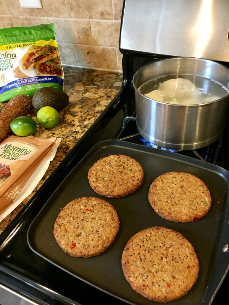 • While the cassava is boiling, fried the Roasted Garlic & Quinoa Burgers patties from MorningStar Farms®