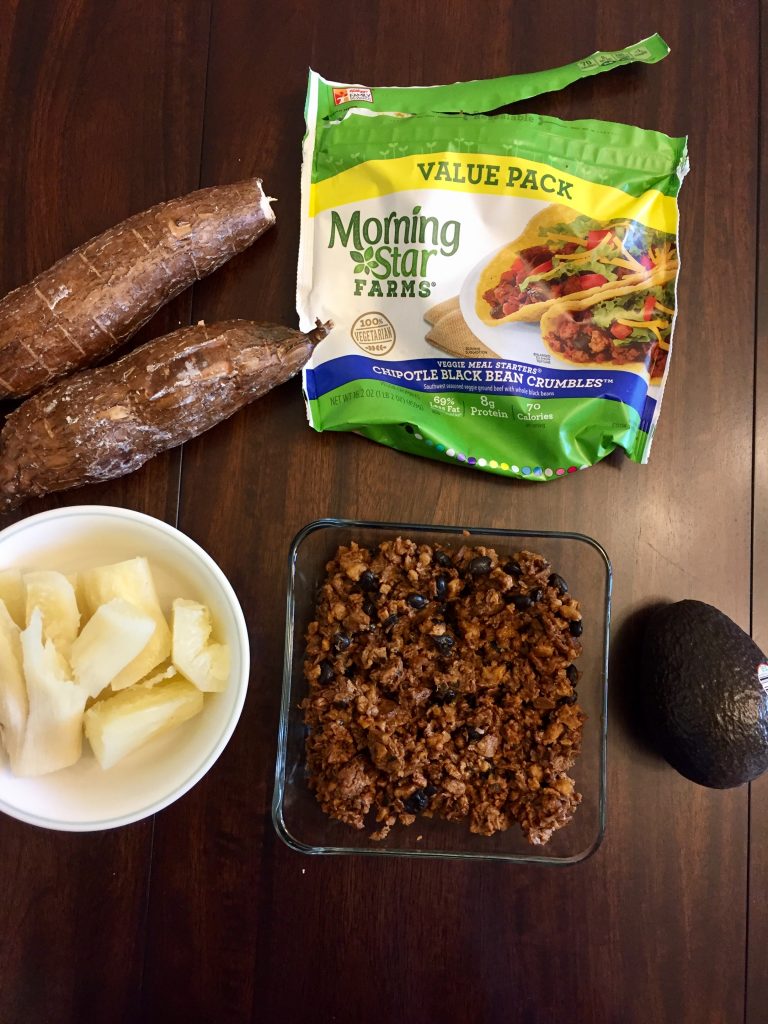 • When the cassava is ready, add avocado and mix it to the delicious chipotle black bean crumbles.