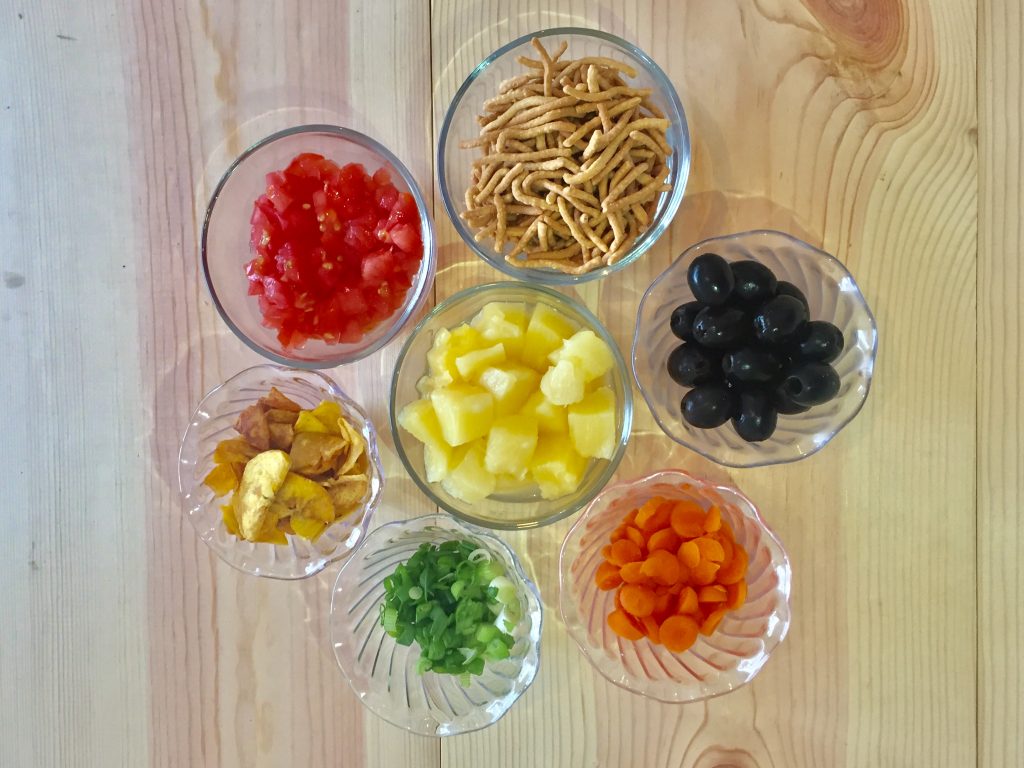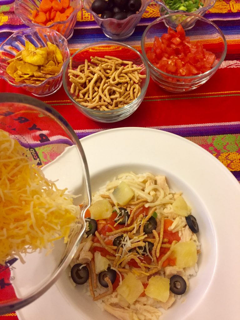 For the toppings, the sky is the limit! I usually make sure to add assorted veggies and whatever I find in the pantry. This time I use: tomatoes, crispy chow mein noodles, black olives, carrots, green onions, drained crushed pineapple and green plantains or chifles!! All great options to add texture and some Latino flavor!