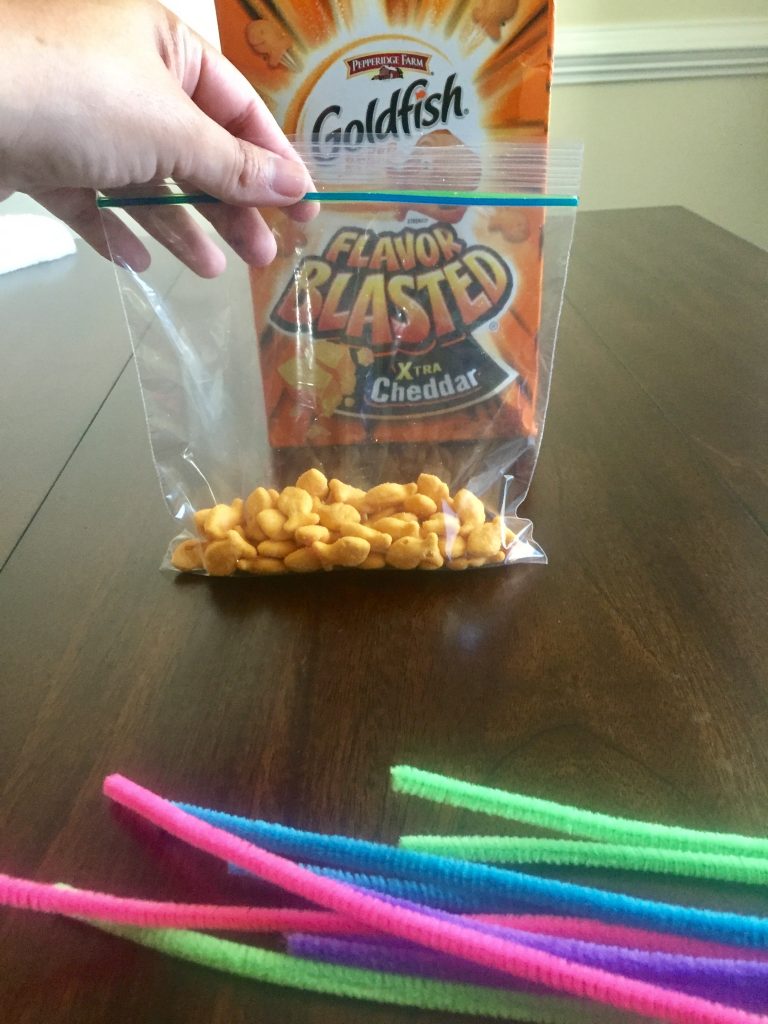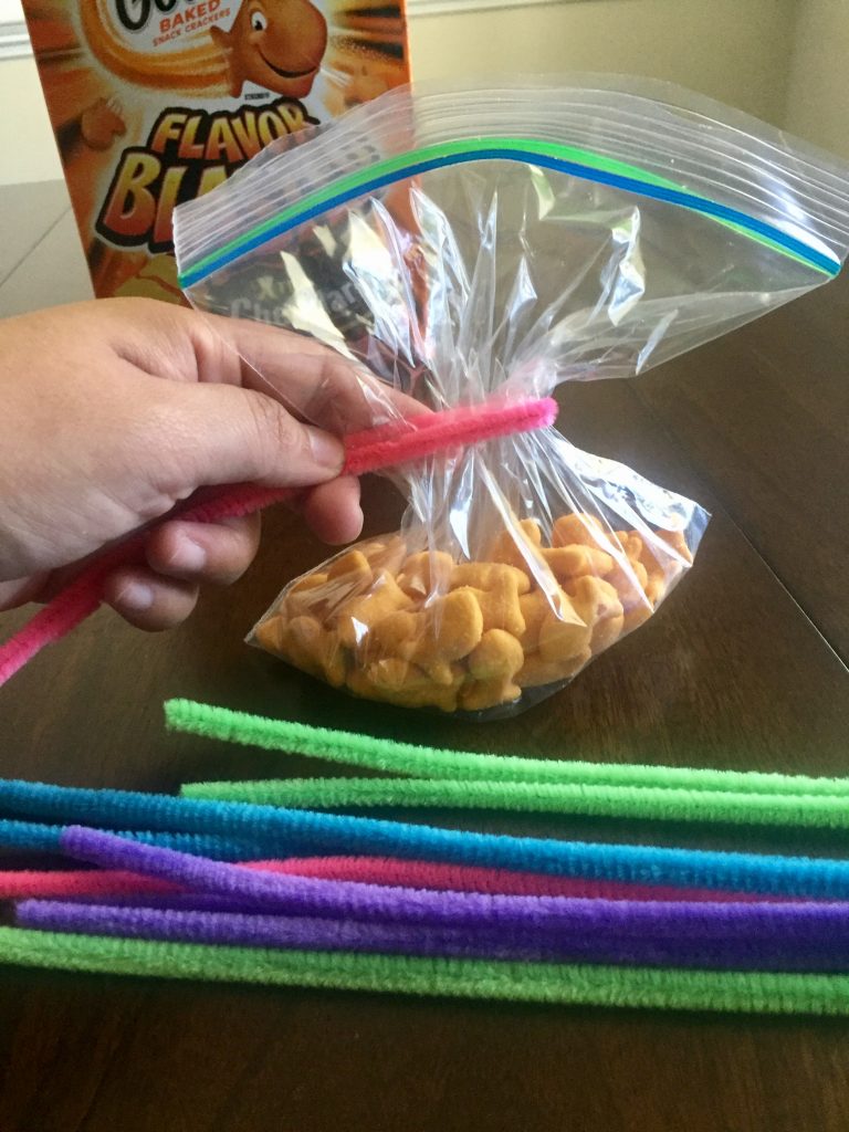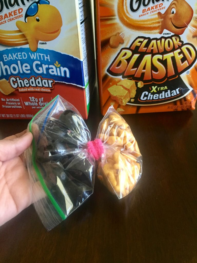 1.Fill the left side of the reclosable plastic bag with Goldfish® crackers.