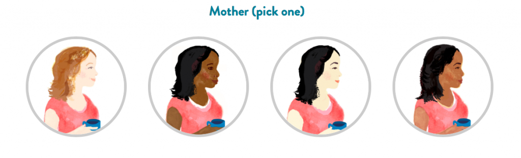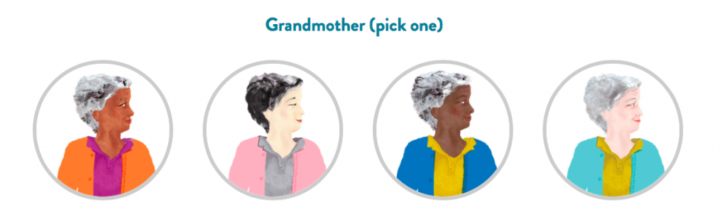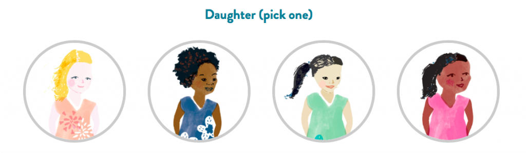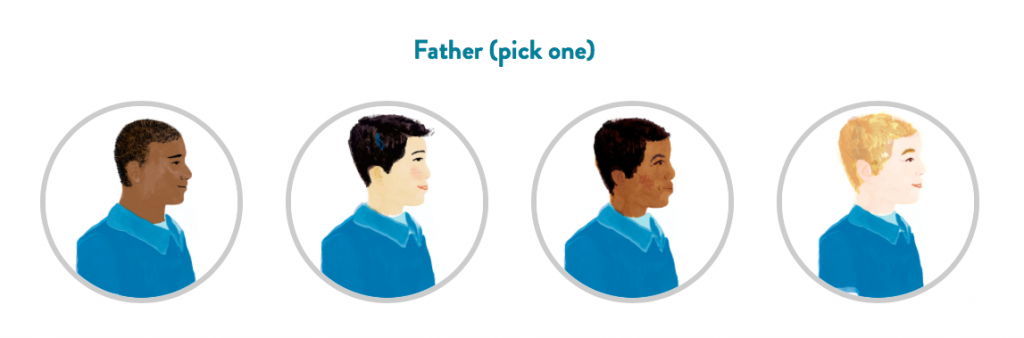 I asked my six-year old to choose the main characters that most reflect her family and this is what she ended up choosing: