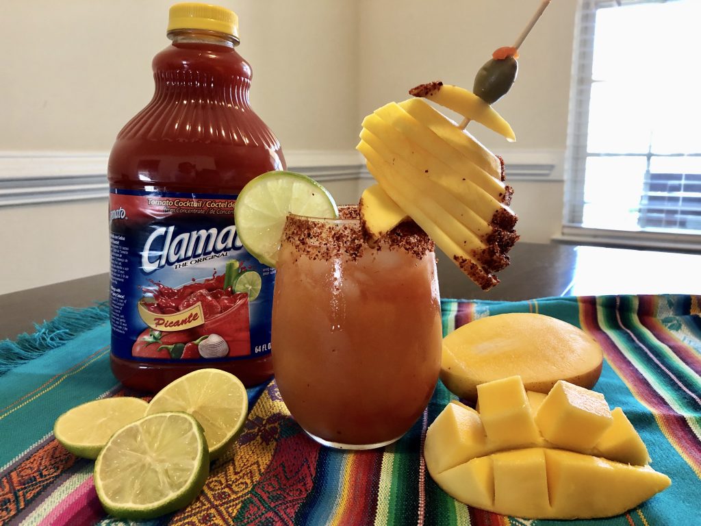 - Combine Clamato Tomato Cocktail Original, mango juice, lime juice, hot sauce and tajin. Stir to combine.